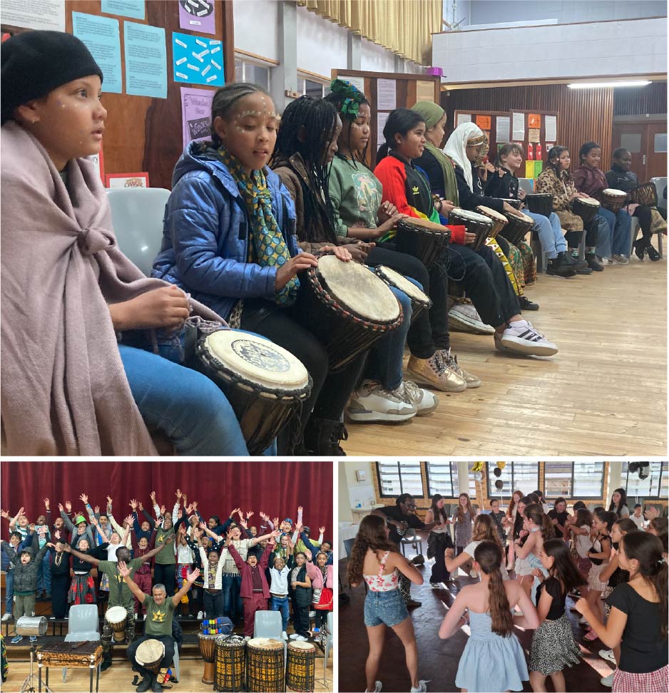 Our drum & dance workshops immerse learners in a lively, hands-on experience. Through rhythm, call-and-response, movement and song, learners are encouraged to listen closely, express themselves and work together in a supportive, high-energy environment. Sessions are joyful and inclusive, helping build confidence, focus and a connection to music while creating a memorable shared experience.