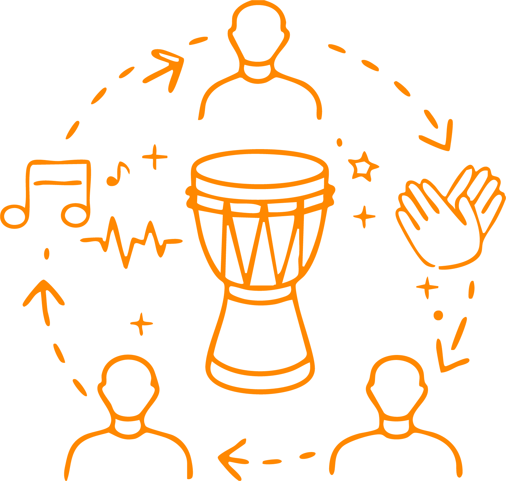 Interactive drumming pulls a room into shared attention fast. From there, we build cohesion, energy and cooperation – a real sense of ‘we’. Our sessions follow a deliberate architecture: a sequence of cues and activities designed to produce reliable group outcomes.